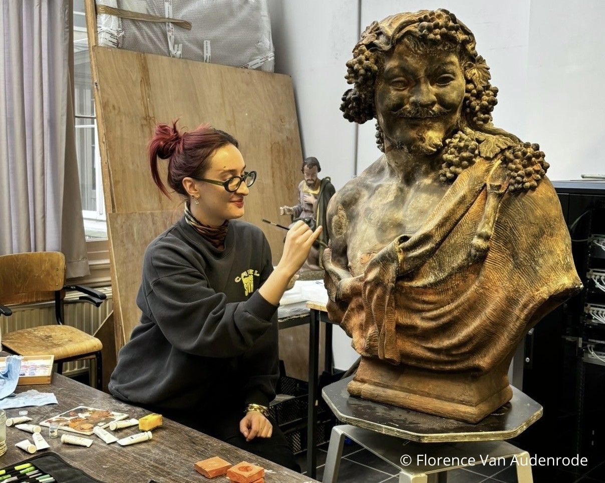 Voor de eerste restauratie in het kader van de samenwerking tussen Museum Hof van Busleyden en de Universiteit Antwerpen viel de keuze op de Bacchusbuste (ca. 1640-1650) van Mechels beeldhouwer Lucas Faydherbe. Het beeld stond ooit prominent opgesteld in de Kruidtuin van Mechelen, maar in 1945 liep het door een val zware schade op aan onder meer de borst en de drapering. De herstelpogingen die daarop volgden – waaronder cementvullingen en overschilderingen – deden afbreuk aan de leesbaarheid en artistieke waarde van het werk.